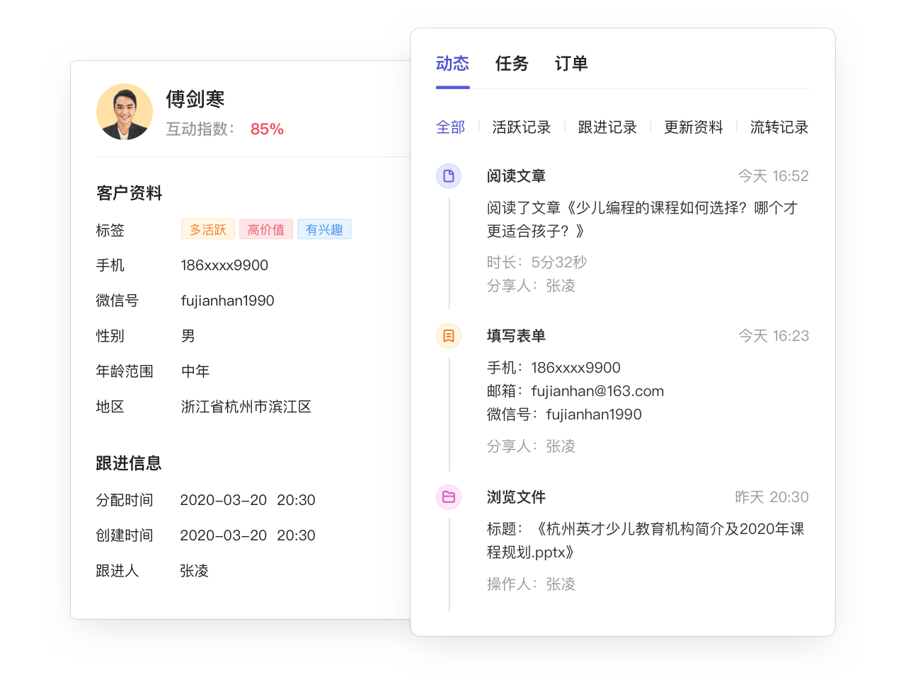 通过互客提供的 CRM 组件,帮你沉淀客户数据资产,高效管理每一个客户。互客 CRM 中不仅记录了客户资料,还按时间轴记录了客户旅程,让你更加了解每个客户
