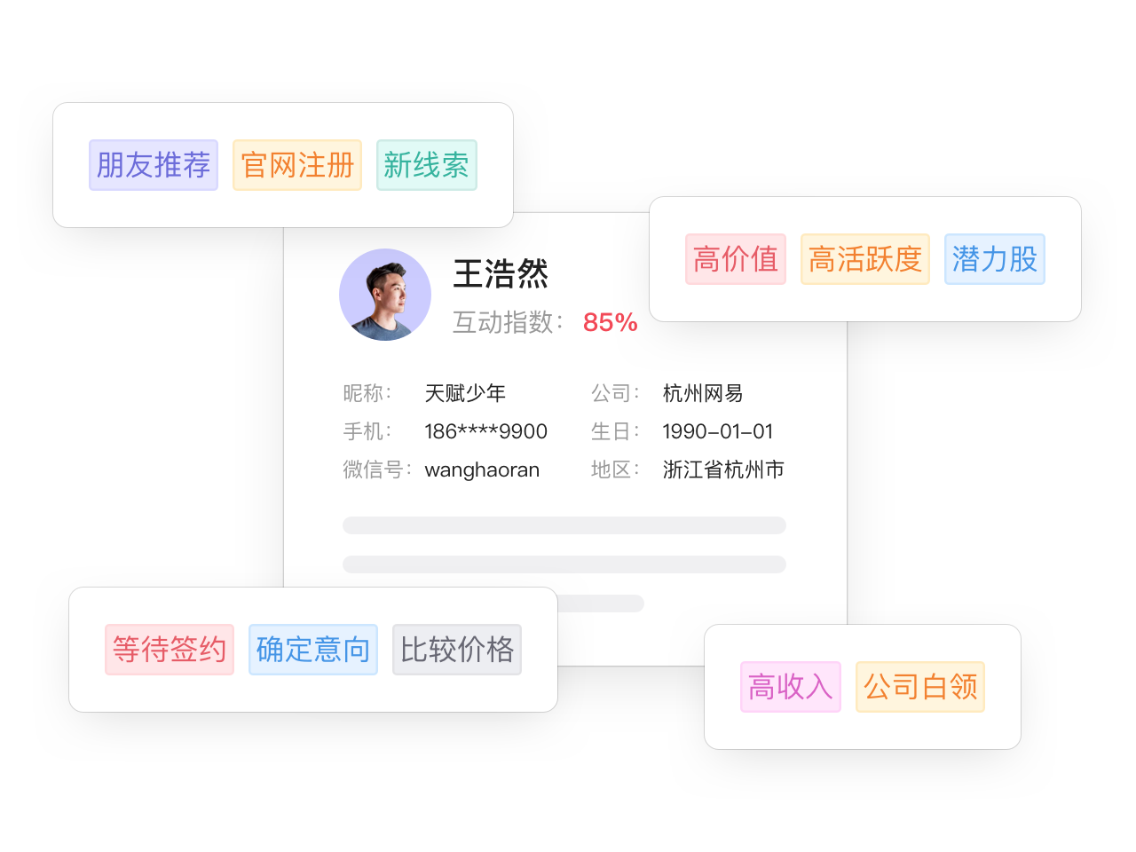 你可以根据自身需求,制定个性化标签体系。员工不仅可以在日常跟进过程中手动给客户打标签,还可以通过内容运营,根据客户的互动行为自动打标签。构建更加丰富的标签体系,识别客户画像