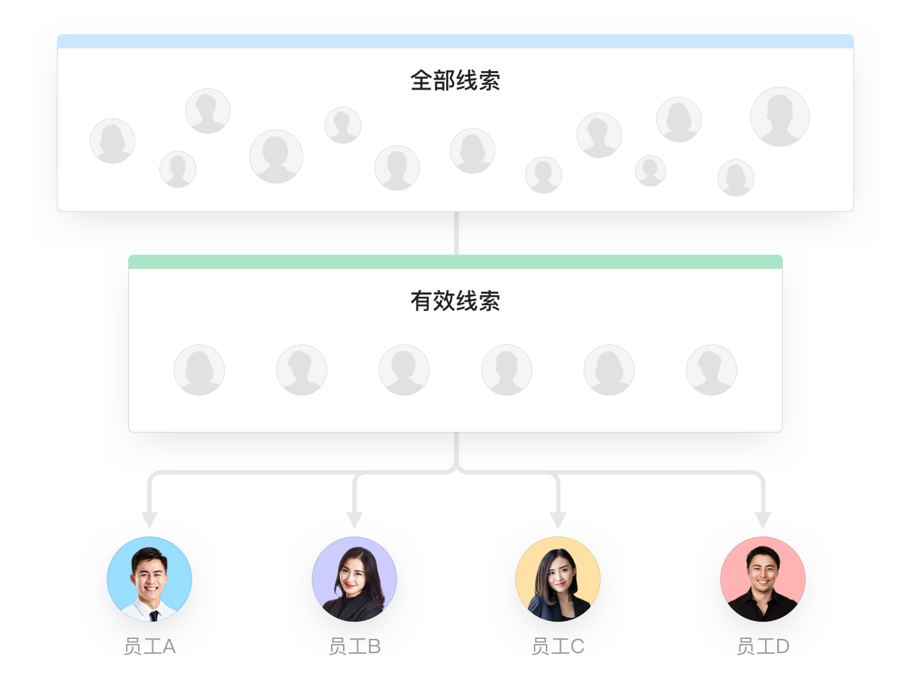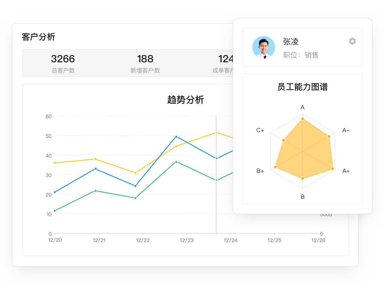 通过智能销售漏斗,关注企业每一步的转化情况,分析客户流失原因,指导管理工作。通过分析每位员工的日常销售行为,制定员工能力图谱和员工数据排行,让每一位员工更加了解自己