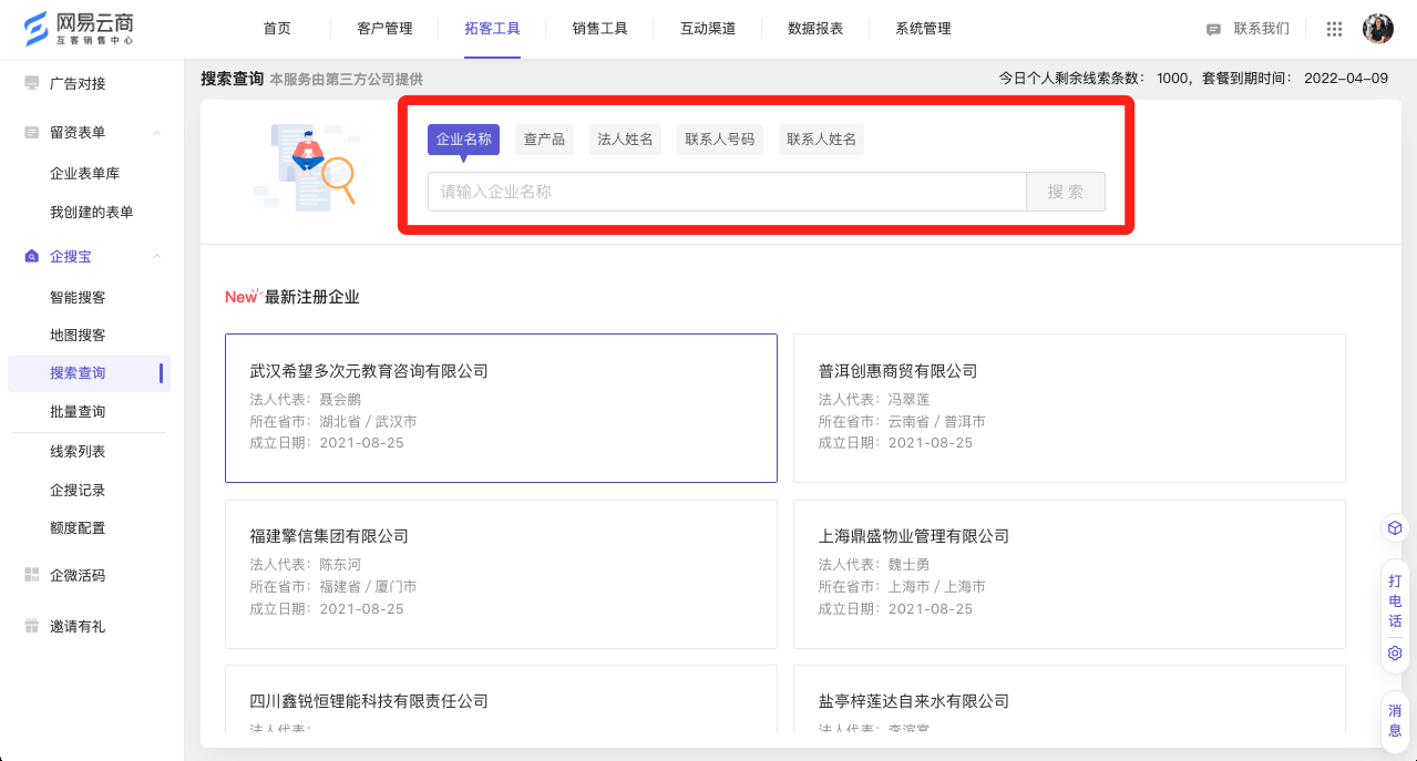 网易互客企搜宝获客系统怎样精准获客助推B2B企业?最先,网易互客企搜宝获客系统遮盖了全国各地 1.3 亿 企业、20 大类领域公布信息资讯、上百个企业层面,多方位助推分析企业数据仓库,不仅是工商局数据信息,并且数据预处理强、升级頻率快;次之,网易互客企搜宝获客系统一站式获客营销服务可完成“找案件线索-通电话-做营销推广-管案件线索-报表中心”系列产品步骤,还能够与“网易互客CRM电话机器人、网易互客SCRM市场销售管理系统软件”无缝拼接,从而协助企业完成“一体化智能营销管理方法云服务器”;最重要的一点,网易互客企搜宝获客系统还能够依据企业本身应用要求,给予“数据信息版、营销推广版”多种多样规格型号版本号套餐内容,协助企业完成“效率高、高品质、成本低”的智能营销获客,且每一个身份证号日查总数能够随意应用,只需每日总查询量不超过企业总金额度就可以,假如还不够用,能够附加再购置总流量,灵便、便捷、不消耗,协助企业真真正正保证将企业推广费用在刀刃上。