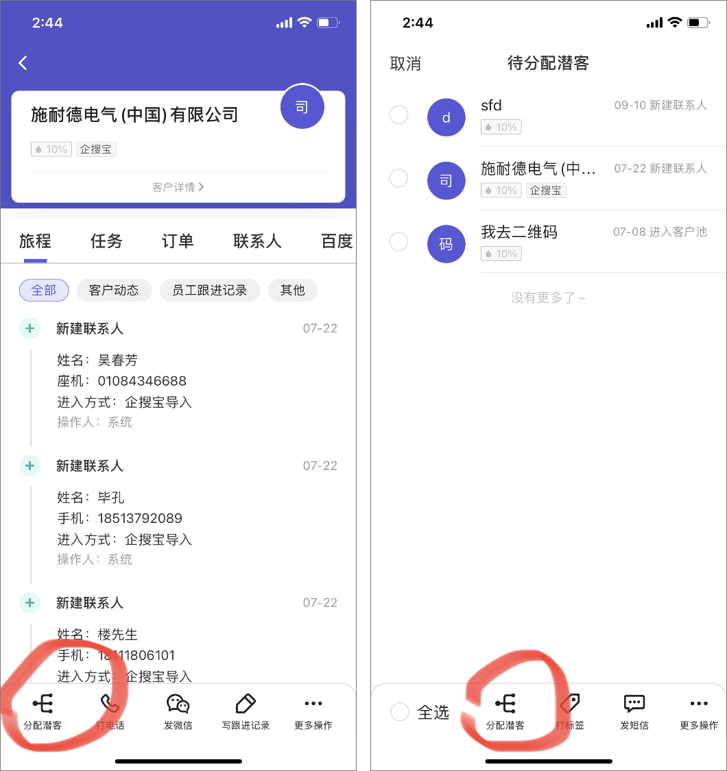 如果此角色勾选了”潜客管理权限”,可以在客户列表和详情进行【分配潜客】。