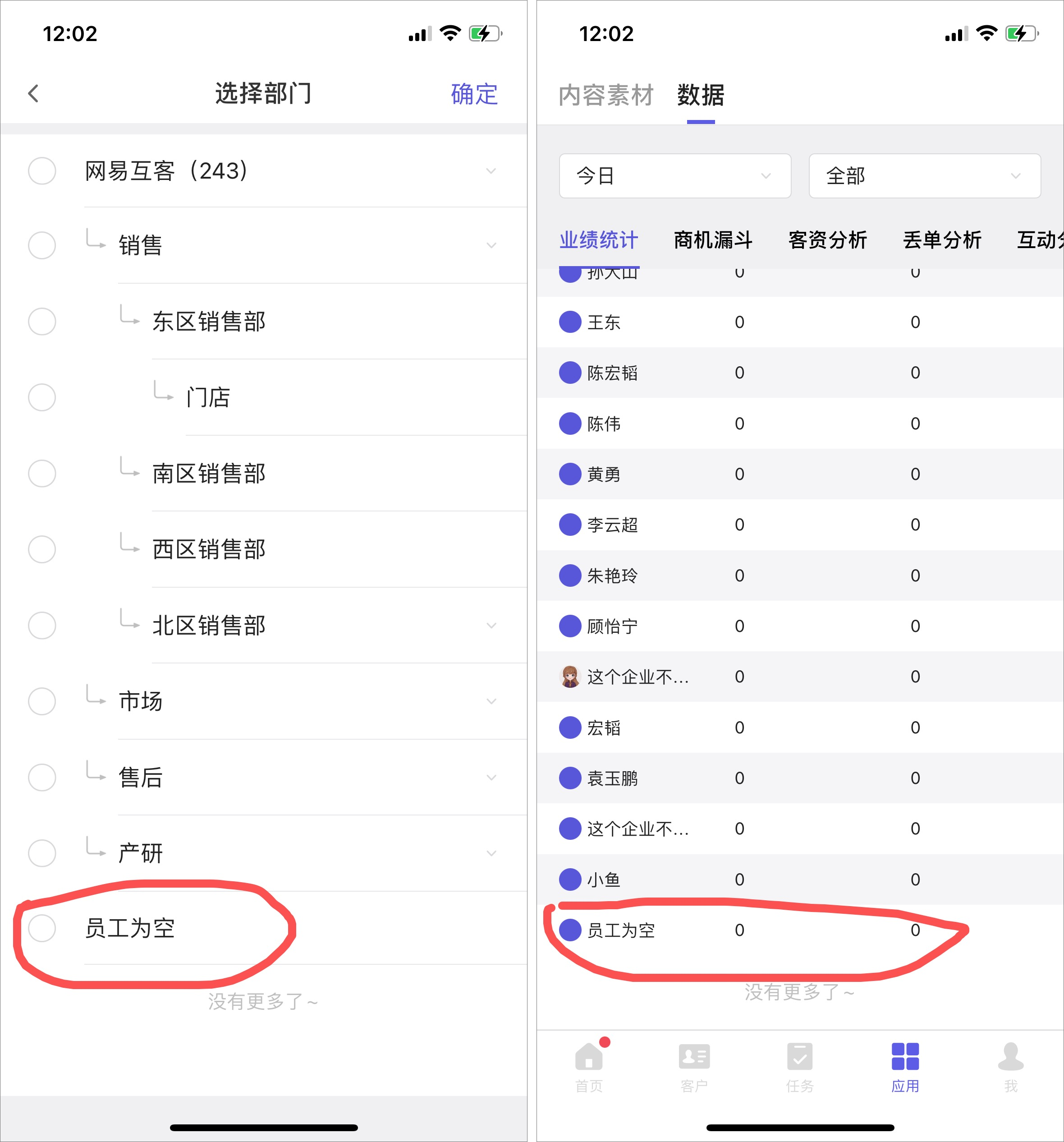 如果你的数据权限=全企业,那你在APP端的数据报表页面筛选员工时,可以选择“员工为空”的选项,查看无人负责的数据。比如:无人负责的商机,系统创建的客户等。