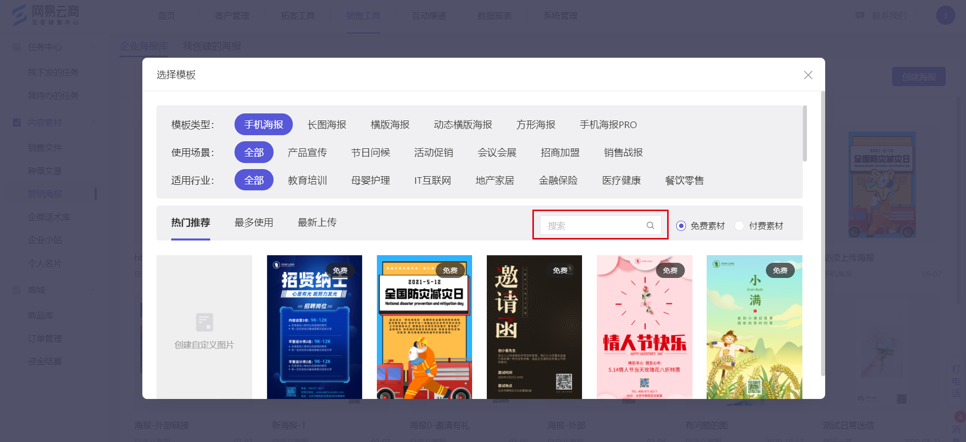 互客销售工具-内容素材中,种草文章、营销海报、企业小站模块,以及商城的商品库模块中使用到图片素材之处,均支持图片素材的搜索功能: