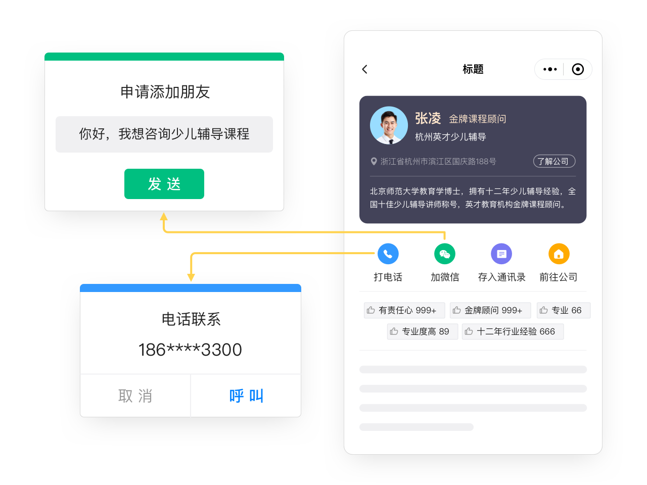 每个员工都可以根据自身特点,打造符合自己人设的小程序名片,树立专业形象。你可以在微信社群和朋友圈分享自己的名片,全方位展现个人特色,吸引潜客。意向客户可通过微信和电话一键与你联系