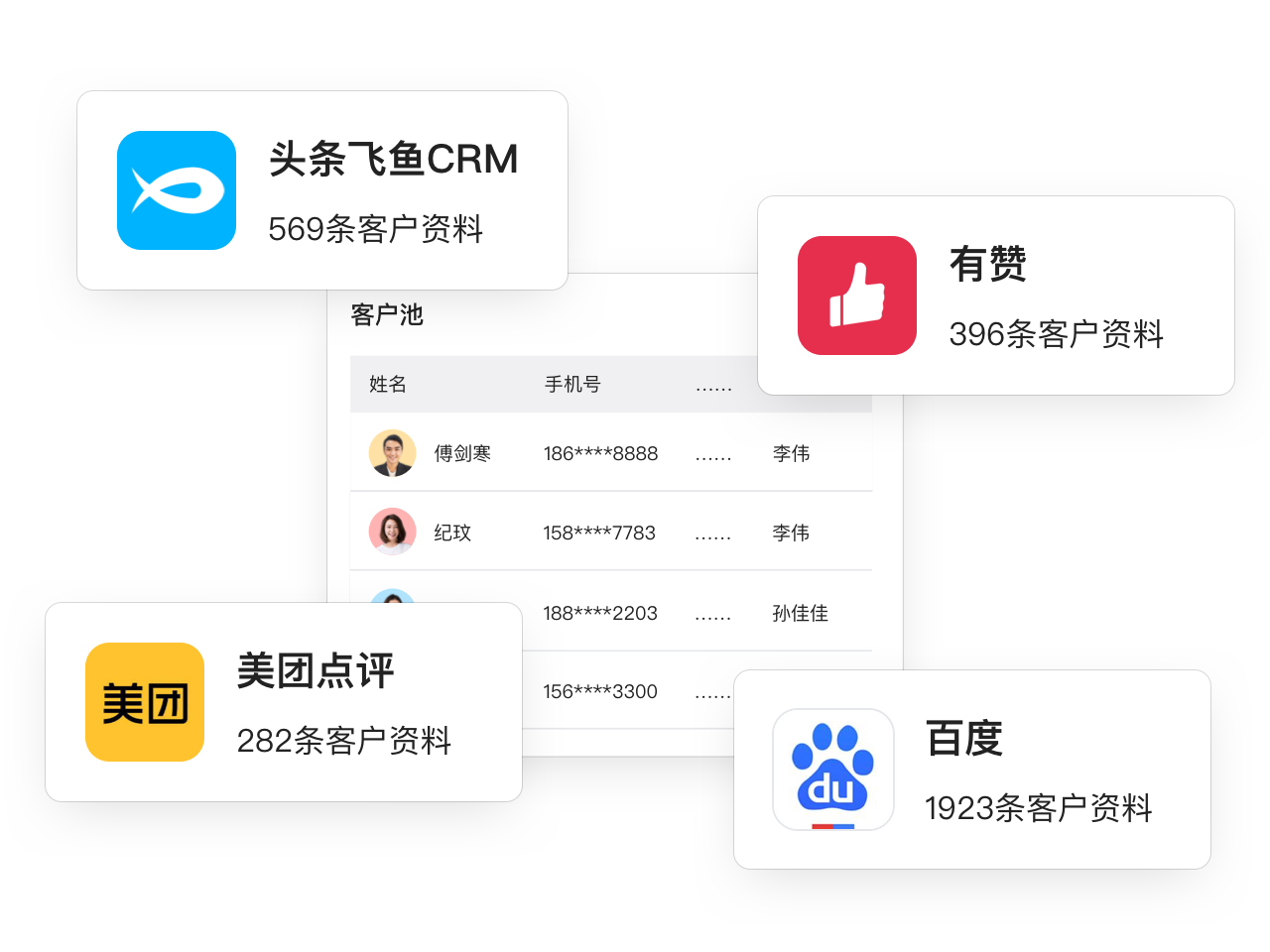 无需二次开发,一键授权即可对接头条飞鱼 CRM、搜索广告落地页,美团点评开放平台,有赞等平台。各个平台的留资数据会自动导入互客客户池,自动分配员工,让跟进更加及时有效