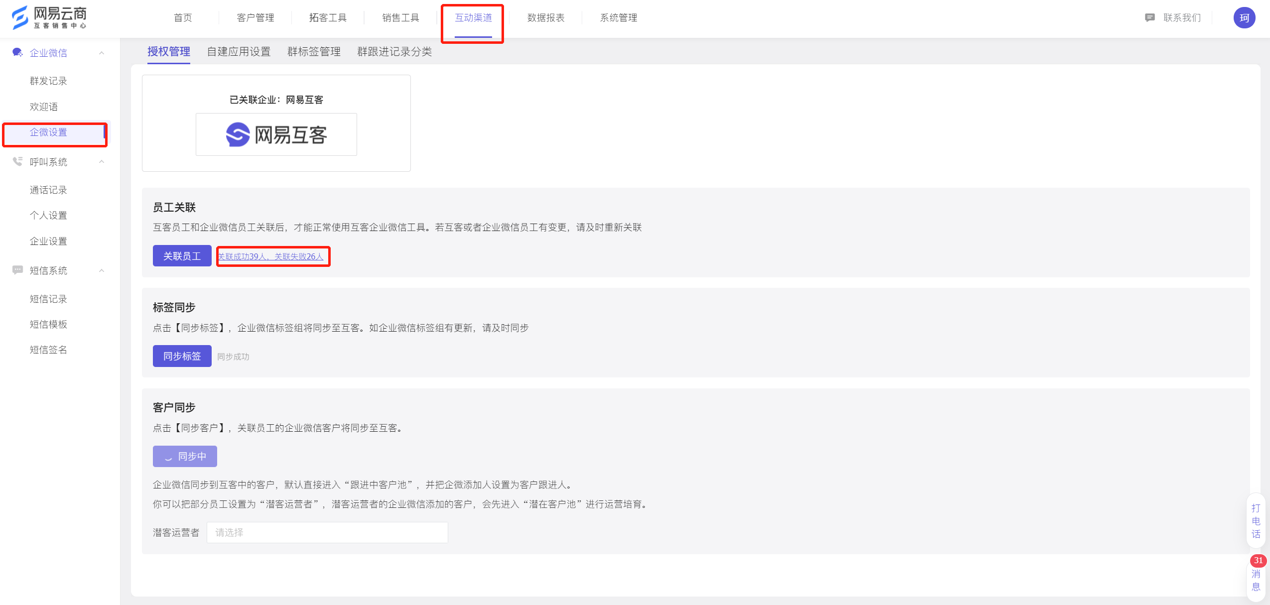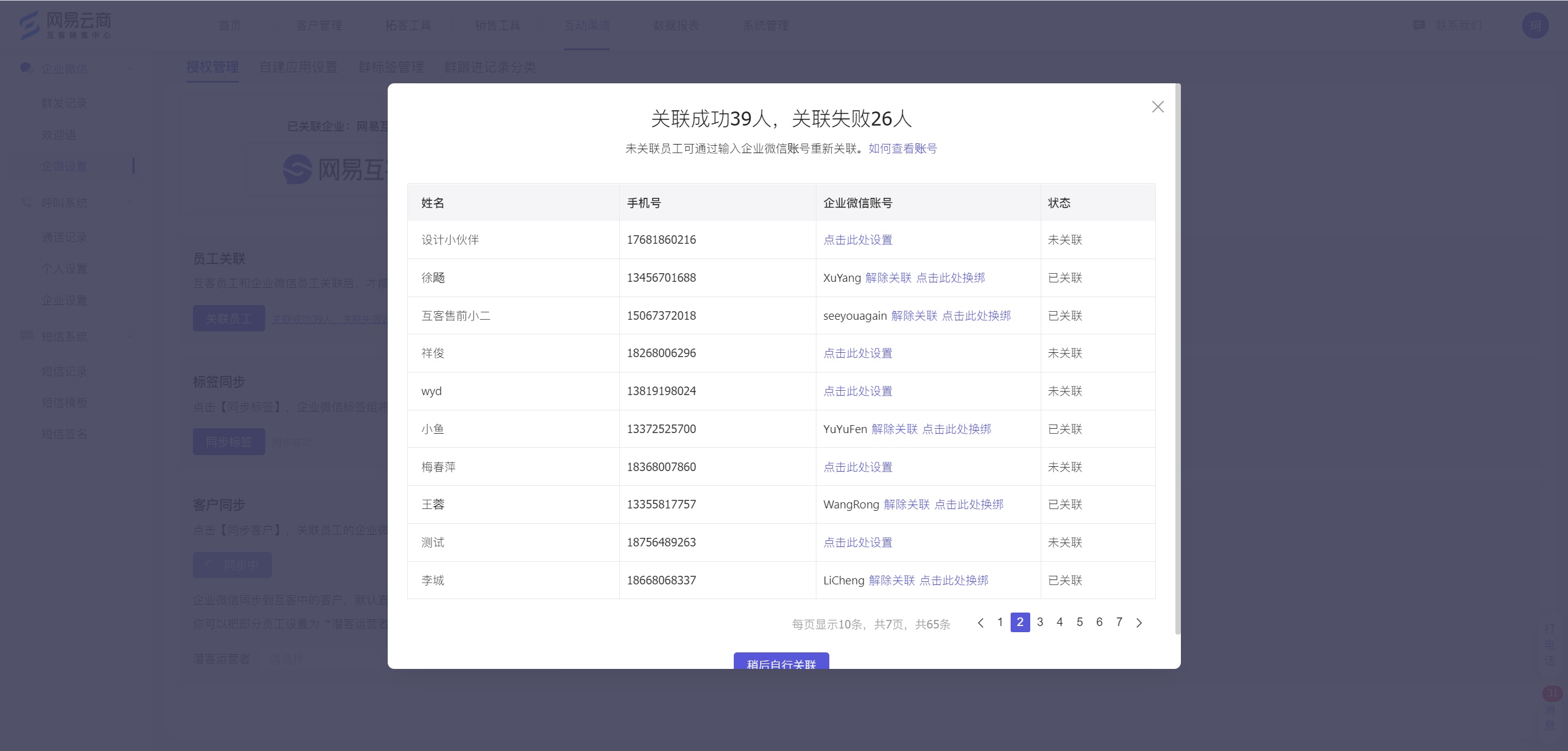 在“互动渠道>企微设置”中,点击打开关联情况弹窗,按需进行解绑、换绑操作即可。