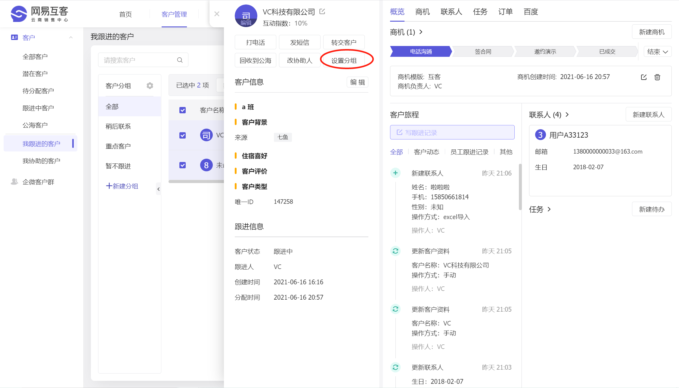 点击客户列表+客户详情的【设置分组】按钮,即可把客户设置在不同分组里;