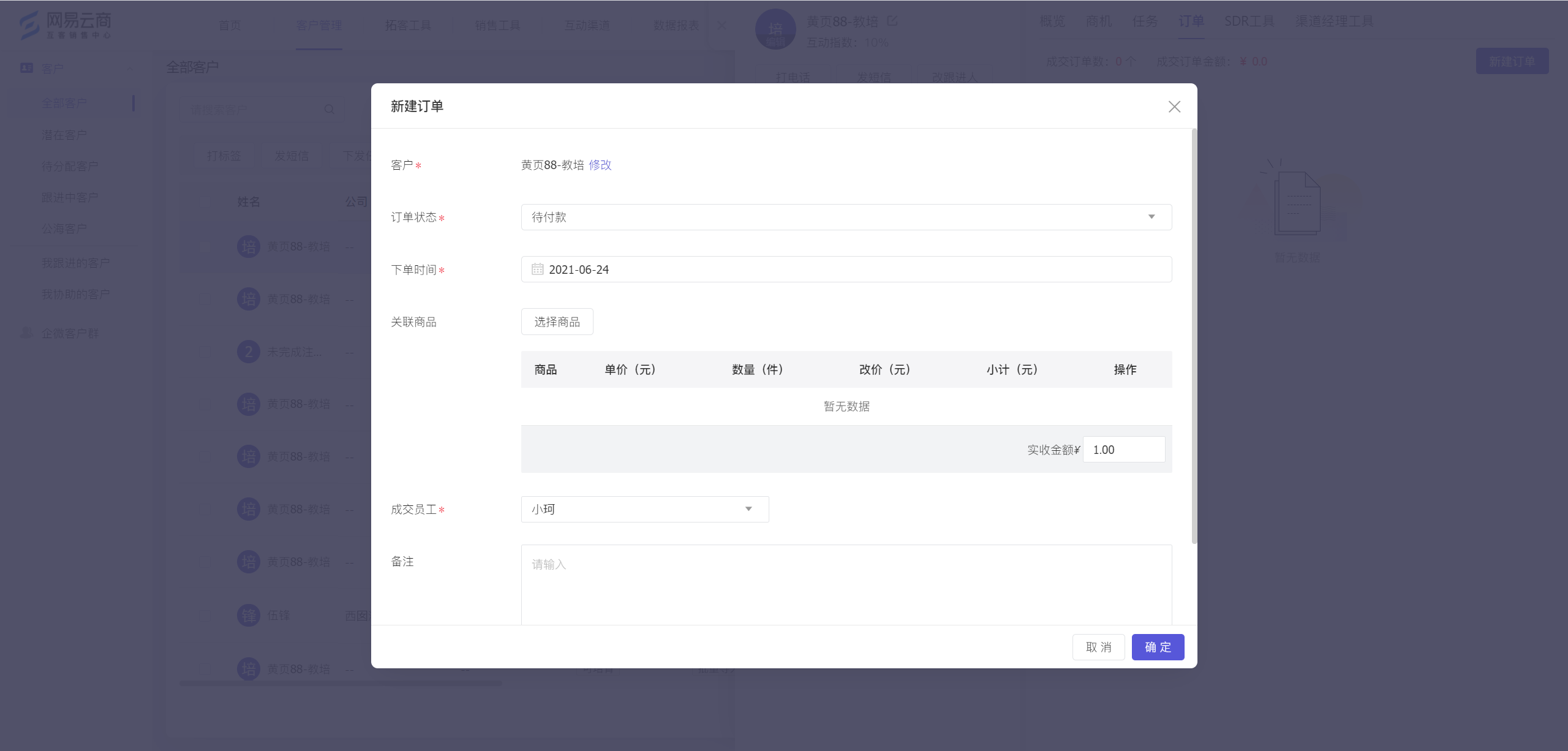 当客户有意向下订单时,可创建待付款类型订单,回款完成后,再将订单成交,再次确认客户实际付款情况。成交后的订单才进入业绩统计。